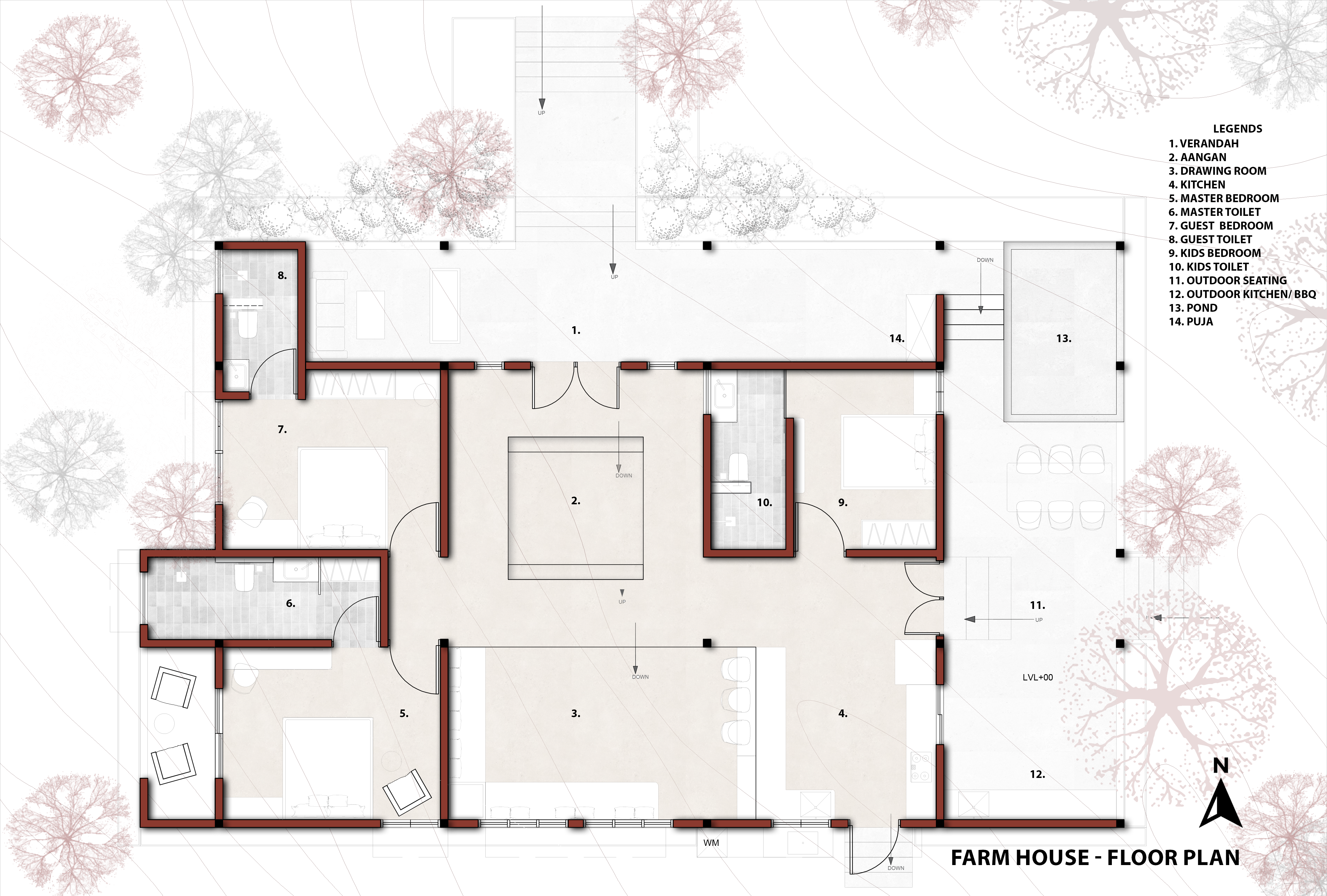 The Enduring Legacy of Bhaskaram One East Design and Infra Studio proudly presents the Bhaskaram farmhouse in Shamshabad, Hyderabad – a compelling architectural statement spanning 2,300 sq. ft. on a generous 43,565 sq. ft. site. This project masterfully fuses traditional Indian design with contemporary comfort, creating a serene escape. Key architectural elements like the classic terracotta-tiled roofs provide both aesthetic appeal and practical insulation. A grand entrance with a welcoming portico sets the tone, while expansive verandahs and patios seamlessly extend the living spaces outdoors, fostering an indoor-outdoor lifestyle. Thoughtfully placed windows maximize natural light and cross-ventilation, ensuring a comfortable and airy interior. The harmonious blend of a serene material palette and robust construction imbues Bhaskaram with a timeless elegance, establishing it as a true sanctuary deeply connected to its tranquil natural surroundings.